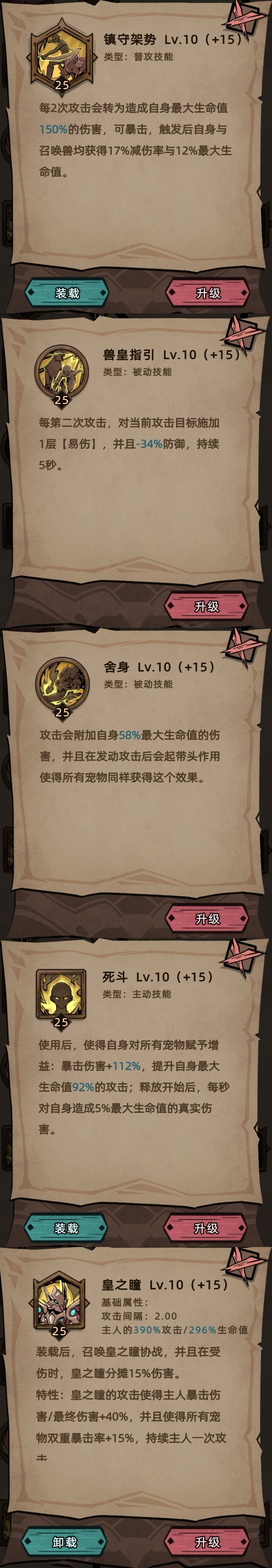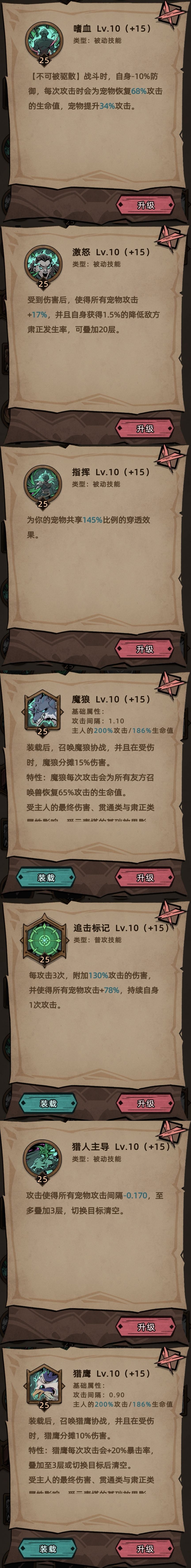 兽王技能所具有的属性:为宠物提供攻击力生命值物理穿透攻击间隔暴击爆伤回血附加伤害,为自身提供攻击力攻速生命值和回血。