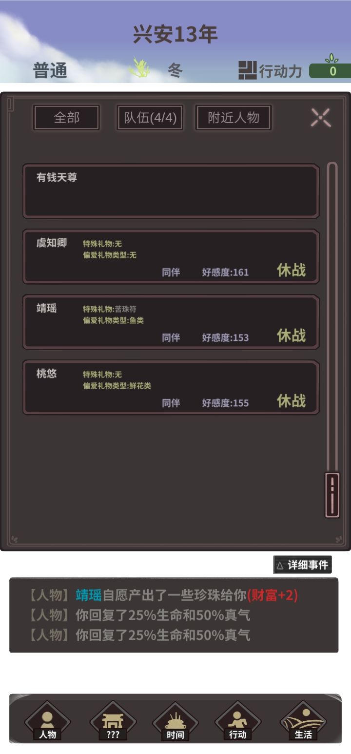 青梅竹马加修仙世家开局就是人生巅峰 先和青梅竹马结婚 利用青梅竹马不掉好感 先把美人鱼拿下 越早拿越好 100财富点就可以 把好感度提到20以上 两同伴都调成休息模式 还有就是实力不超过三阶30岁之前,平遥城那里有一个镇妖位和商贩也可以得到npc 同伴