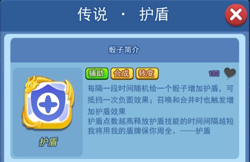 护盾骰子是一个辅助性质的骰子,它可以每隔一段时间随机给一个骰子增加护盾,可以抵挡一次负面效果;同时召唤和合并和出发增加护盾效果。护盾的点数越高,释放护盾技能的时间间隔越短。