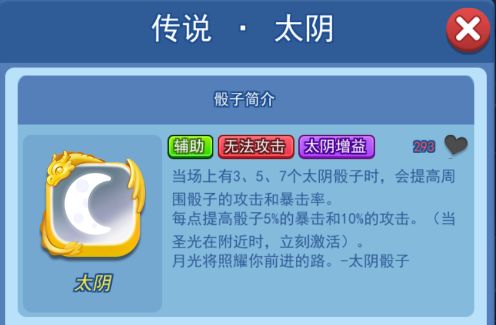 太阴骰子没有攻击力,它的攻击特效是给周围骰子增加攻速,当场上存在3、5、7个太阴时。会额外提升暴击率和攻击力。