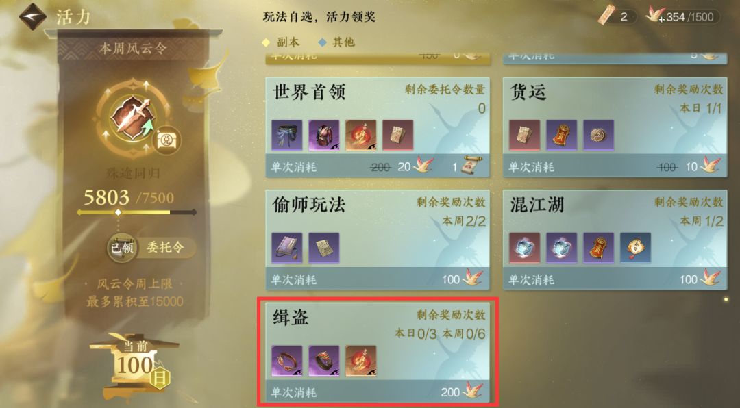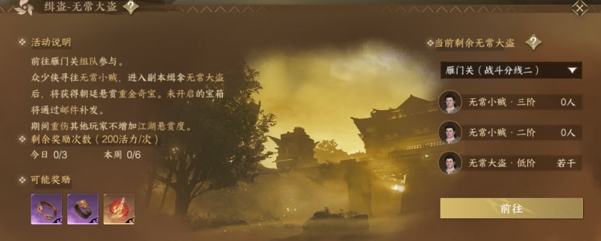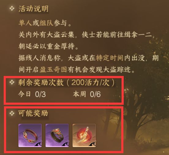 - 无常大盗:每日6个时间段前后出现,有不同难度的盗贼,难度越高,奖励越好。
