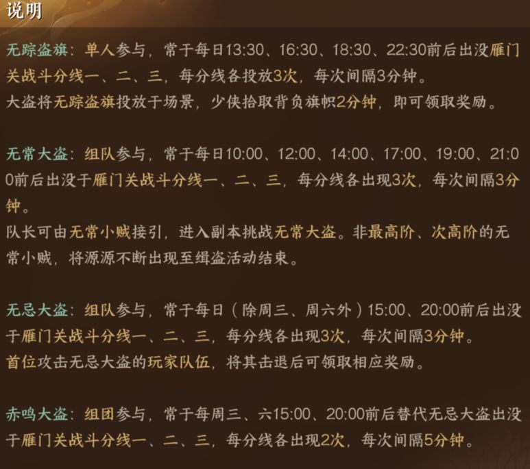 - 赤鸣大盗:每周3周6,2个时间段出现,代替无忌大盗。
