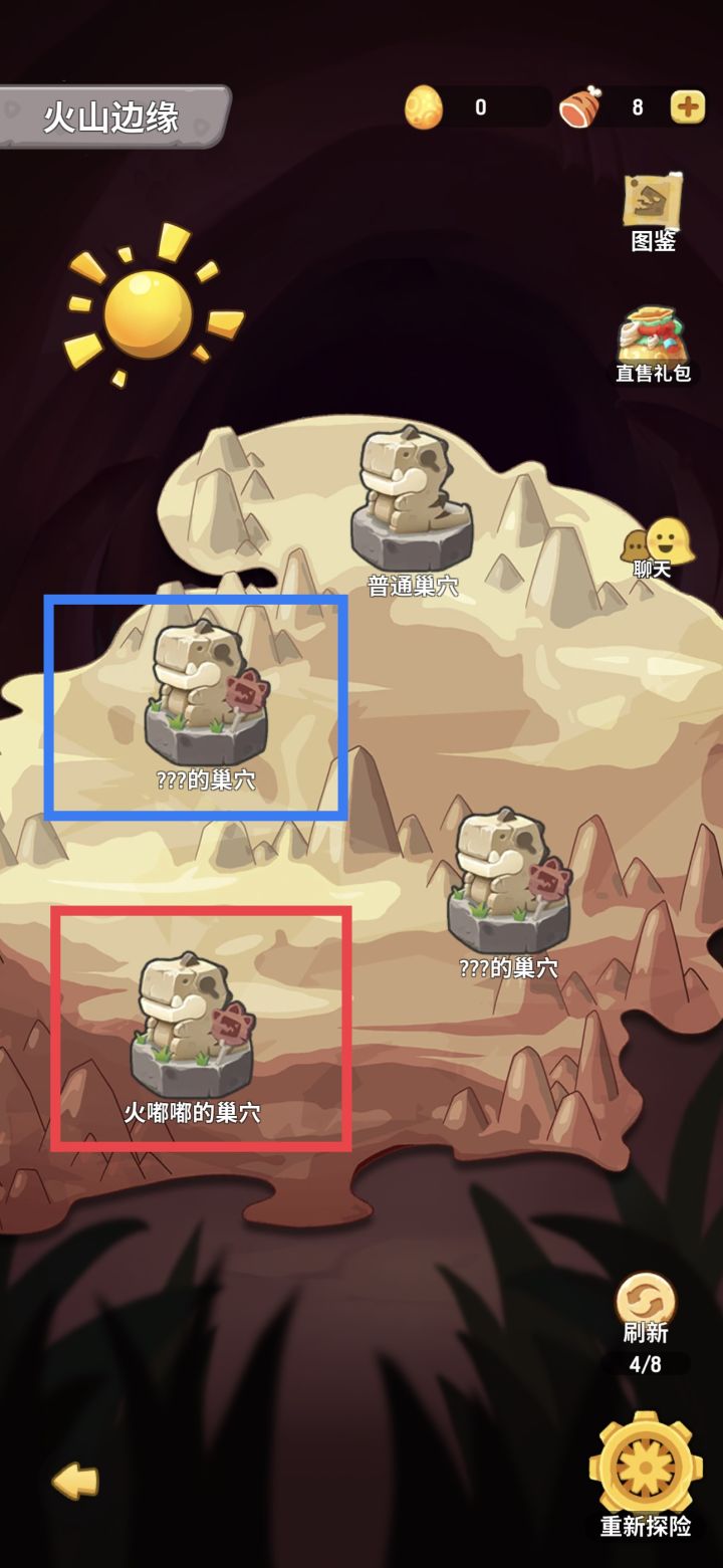 2.本次的赛季主题是偷蛋,也是比较创新的一次了,而且赛季里的头像好评,看着贱兮兮的感觉。跟狗头表情有异曲同工之妙。书归正传,偷蛋每天有4次免费探险机会,需要我们根据想要收集的宠物的习性选择探险的区域和时间,如火山,冰川,正午,黄昏,而且还分边缘,内部之类的,务必记得点击重新探险选择区域。每次探险会刷新4个不同的宠物巢穴,如果是已经出现的图鉴,就会提示宠物的名字,如果是未知图鉴就会标注???,在探险过程中,有概率将会刷出珍稀巢穴,也就是有气味的闪光的蛋,这种蛋越多越好。