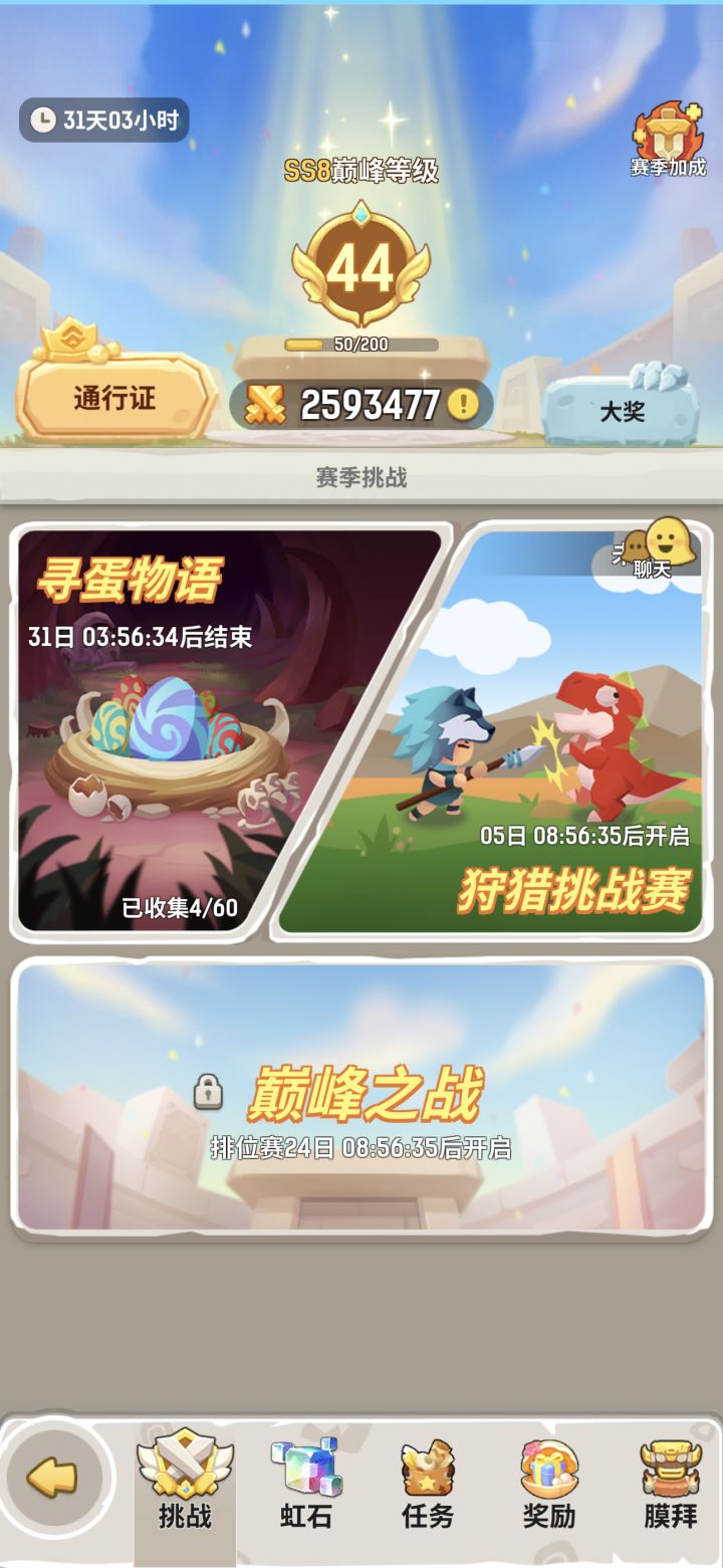 1.赛季模式同以往 ss 赛季基本相同,本次赛季任务以英魂和世界打兔子为主,另外就是偷蛋次数和体力了。通过完成挑战任务,周常任务,以及每日膜拜可以获得巅峰积分提升巅峰等级。根据以往赛季经验,纯白嫖,而且不买体力的情况下,基本能到 200 级左右。