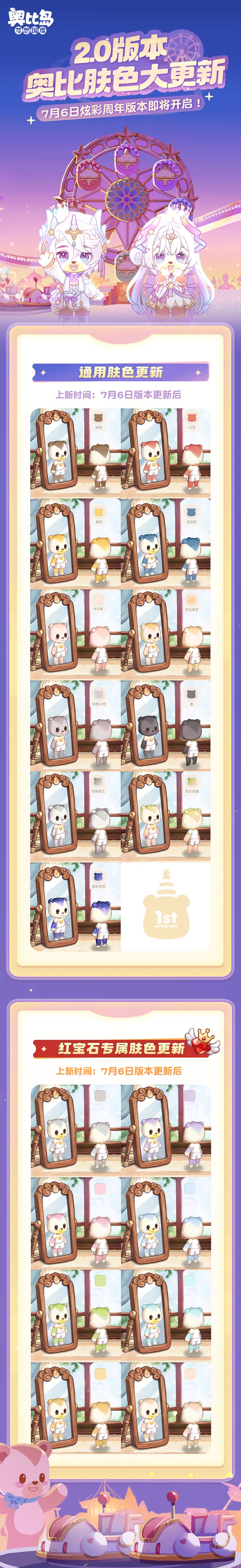 7月6日版本更新后,小奥比前往淘宝街找到阿拉斯即可解锁更多新肤色!本次更新不仅上线了拥有经典“焦黄小嘴”的红色棕色等新肤色,还有熊北鼻、阳光麦芽、伯爵之息等主题肤色等待奥比们体验~与此同时,红宝石权益也换肤功能上也做了全面升级。除了可以免费更换所有肤色外,还有八个红宝石专属【炫彩】肤色上新,彰显闪耀身份!