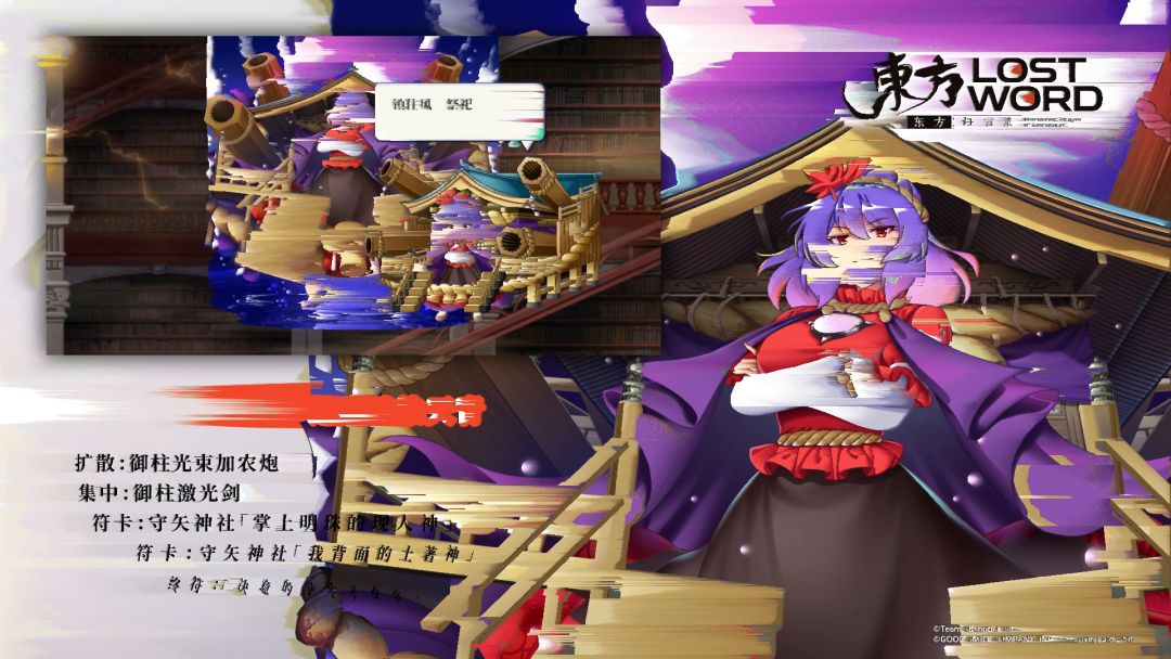 果然是你吗。那看来这漫长的路途总算是要结束了。我是八坂神奈子。是曾经失去了信仰,并且没能守住宝贵存在的……不中用的神灵。但我像这样背着“武装拜殿”,一个一个拾起了失去的东西。就差一点了,就剩我的家人了……。所以,拜托你了。相信我,并跟随我吧。
