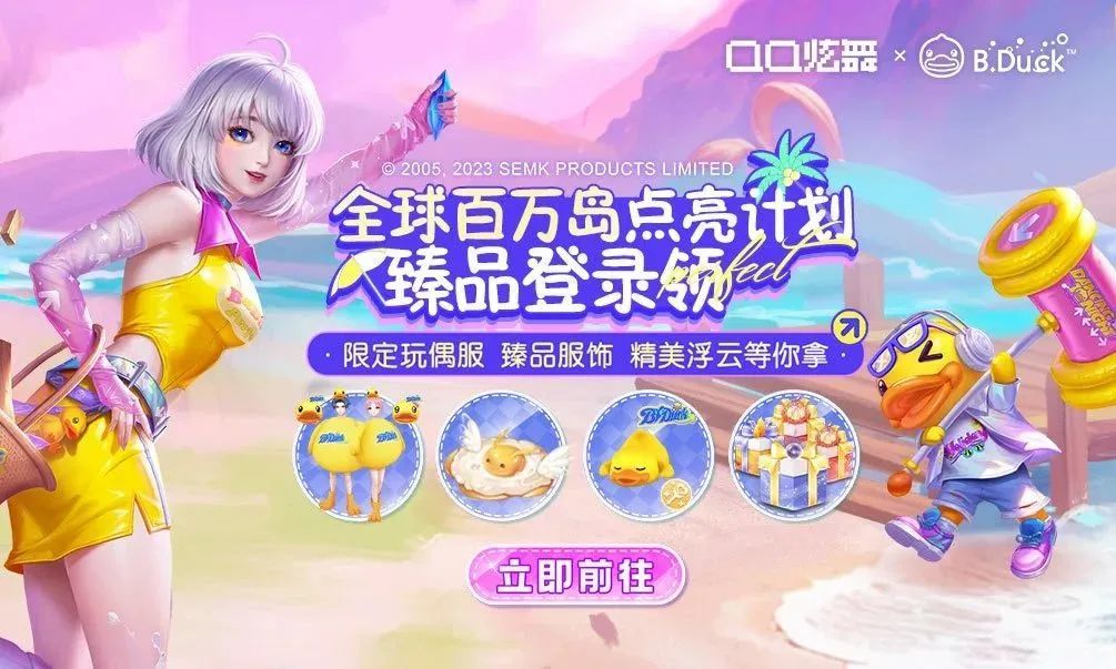 7月1日至7月21日期间,玩家在小岛上打造任意一个建筑,即算作点亮自己的小岛,全服累计一定数量的小岛点亮后,玩家当天登录游戏后即可领取B.Duck臻品变身手持-趴睡鸭、轻奢浮云-沐光游嬉、B.Duck高档组合装-玩偶鸭&B.Duck高档头发-来摇头鸭等对应奖励!分享页面活动/留言还可额外获得极光抽奖礼包*5~