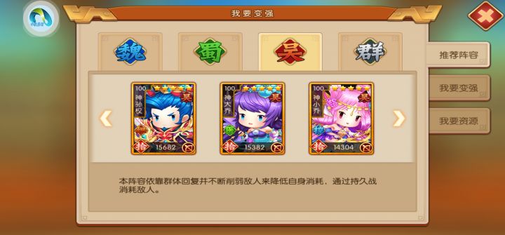 官方都推荐的基础神吴队,你绝对值得拥有。主打的就是一个持久消耗,打野地打城表现都很不俗,三个武将都可以通过功勋、荣誉换取,获取难度低。