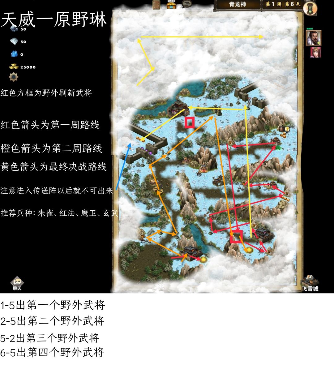 打法思路:开局我们把身上的兵力全部放在城里然后往右边走进入传送阵可以到达第二座城池那里,占领城池把下面的资源矿占领,接着就往上面走把路上的资源矿属性全部拿了在第一周第四天的时候就往回走,第一周第五天第二座城池那里会刷新一个敌方武将,解决完他我们继续把上面没有占领的资源占领了然后把雕像选择加属性(装备好的选择加行动力)拿完属性我们去右上方法师塔把红法招募走就开始往第二座城池那里赶第二周第五天会刷新敌方武将,解决完他我们把兵力放进家里然后去把寺庙那里的青龙全部灭了就可以回去把两座城池的兵力全部拿了去攻打第三座城池。拿下城池以后就是开始招募兵的时间,这关有没有时间限制不记得了我是在第七周左右进的传送阵(注意传送阵进去以后就出不来了)先打一次青龙神,打完青龙神还会再打一次这次他有英雄助阵所以在打一次的时候尽量少损兵力。