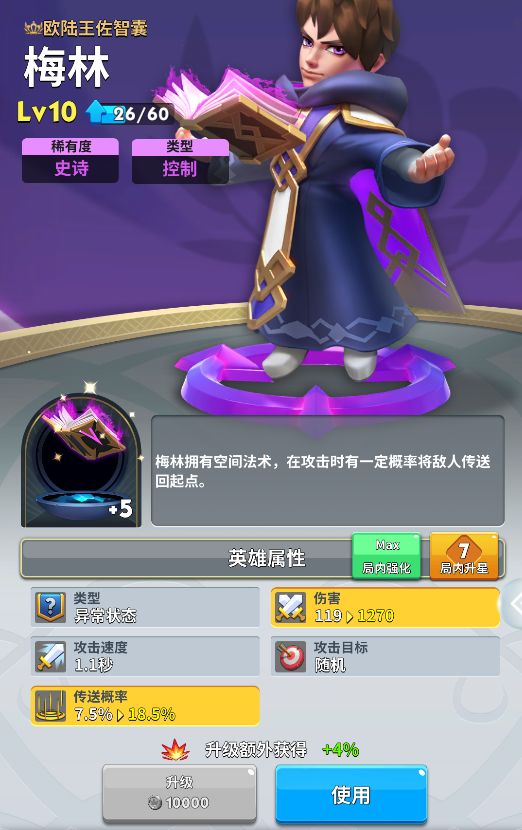 梅林的英雄定位是控制英雄,局内强化和升星都会提升基础伤害和触发传送的概率,在对局中的强化和升星优先度高于其他辅助英雄,仅次于阵容中的主力输出英雄。