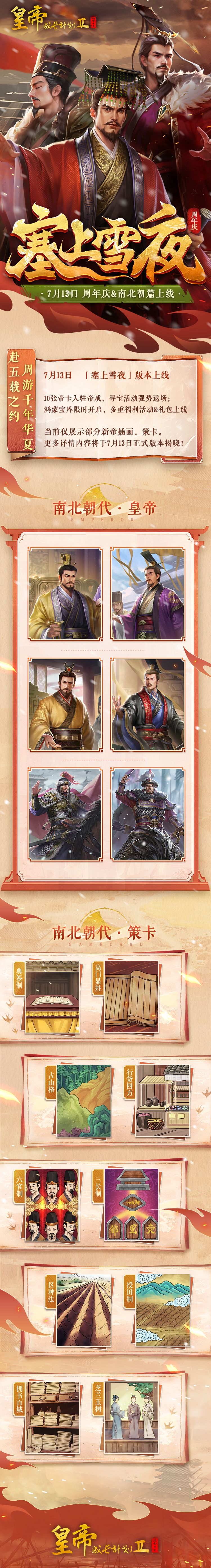 最后让我们一起期待《皇帝成长计划2》7月13日五周年庆&「塞上雪夜」版本的正式上线吧!