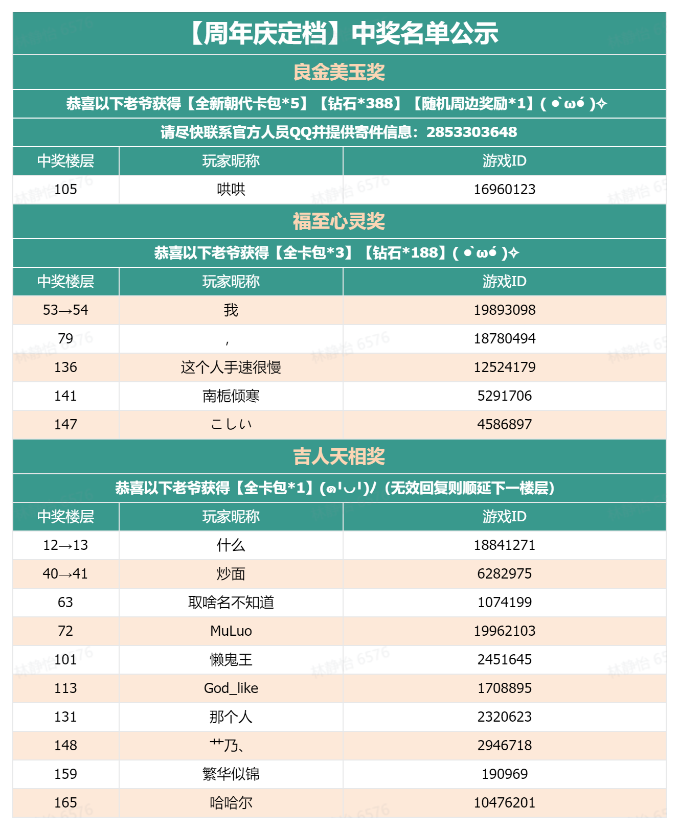 中了实物周边的老爷请添加官方人员QQ:2853303648,并附上您的昵称、地址及联系方式,以便我们尽快发奖~再次感谢!