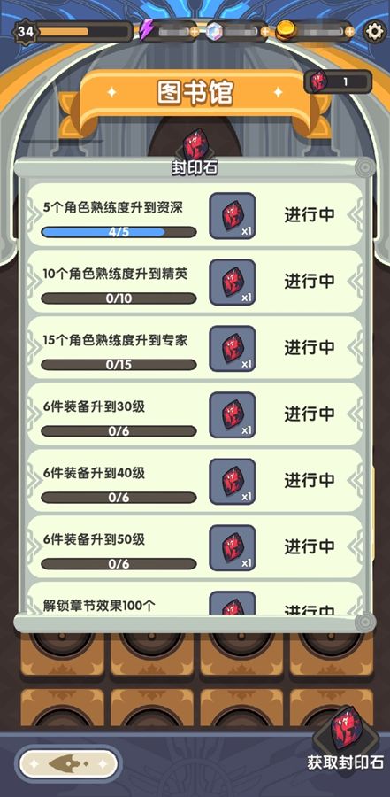接下来就是重点了。大家可以在图书馆右下角看见“获取封印石”,这就是我们常说的封印石任务。在这里,完成特定任务就可以获得封印石。任务内容主要包括提升角色熟练度、升级装备、解锁章节效果、解锁高级天赋、通过秘境层数等,难度系数中等,稍微努力都能完成不少。至于这个封印石能做什么呢?(因为很重要所以单独提出来)