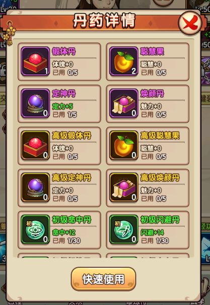 6、灵丹:选择丹药给弟子使用,不同的丹药增加属性不同,使用限制不同。