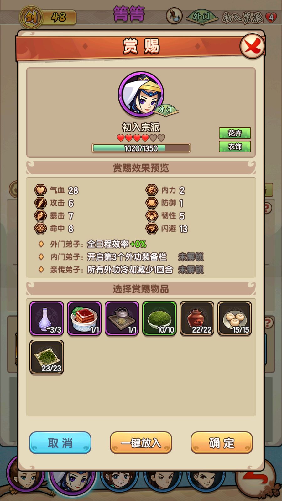 3、初入宗门:点击可查看弟子在宗门的地位以及赏赐效果预览。(同赏赐按钮进入界面一致)