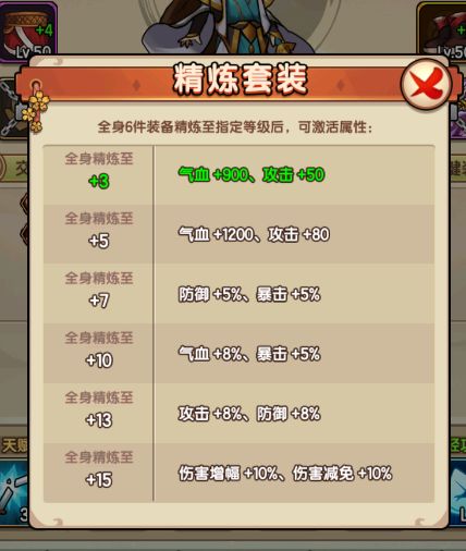 全身6件装备精炼到指定等级后,可激活相应属性。