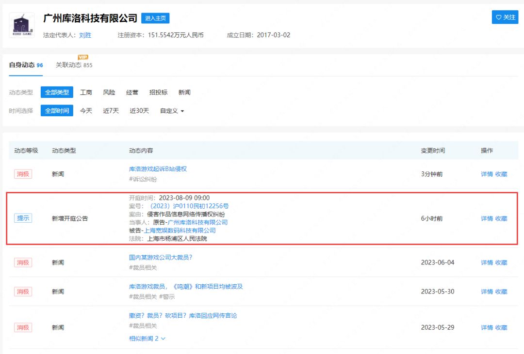 据企查查app显示,库洛游戏关联公司广州库洛科技有限公司今日新增一则开庭公告,被告为 B站 关联公司上海宽娱数码科技有限公司,案由则为侵害作品信息网络传播权纠纷(因侵害著作权人以有线或无线方式向公众提供作品的权利而产生的纠纷),该案件将于8月9日在上海市杨浦区人民法院开庭审理。