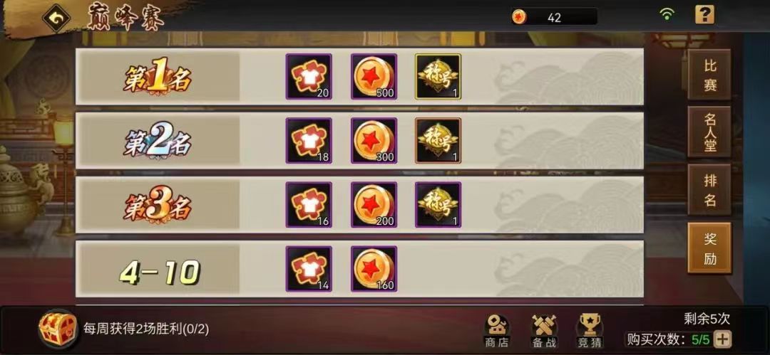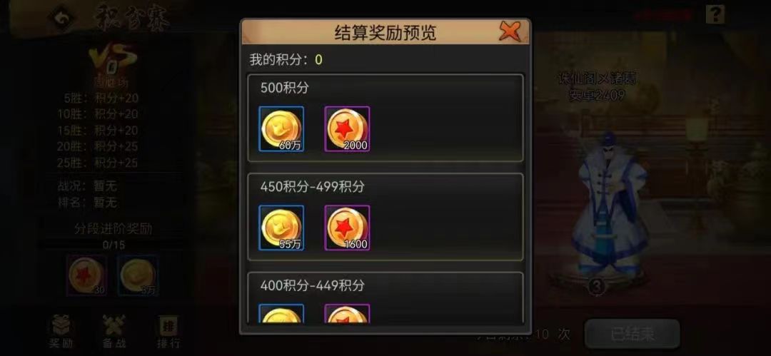 积分赛采取分段进阶奖励制,可以获得金币、荣耀币奖励,由于没有元宝奖励,和一些玩法还有一定的“时间点冲突”,也是各种竞技玩法中,参与度最低的玩法。