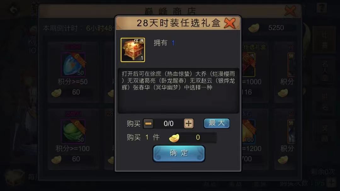 巅峰赛和排位赛玩法类似,巅峰赛可谓最佛系的竞技玩法,采取月赛制,每周日晚上开赛,玩家具有5次免费挑战机会,还可以额外购买5次。它的奖励有别于其它竞技玩法,另辟蹊径,可以获得荣耀币、时装碎片、称号,在巅峰商店更是可以用极低价格购买各种好物,时间轻松、赛局不多,特别奖励又是如此的喜人,让巅峰赛的参与度明显高于积分赛,尤其是极低价的时装礼盒和6折武将碎片,非常诱人,喜欢的小伙伴,完全值得拥有。