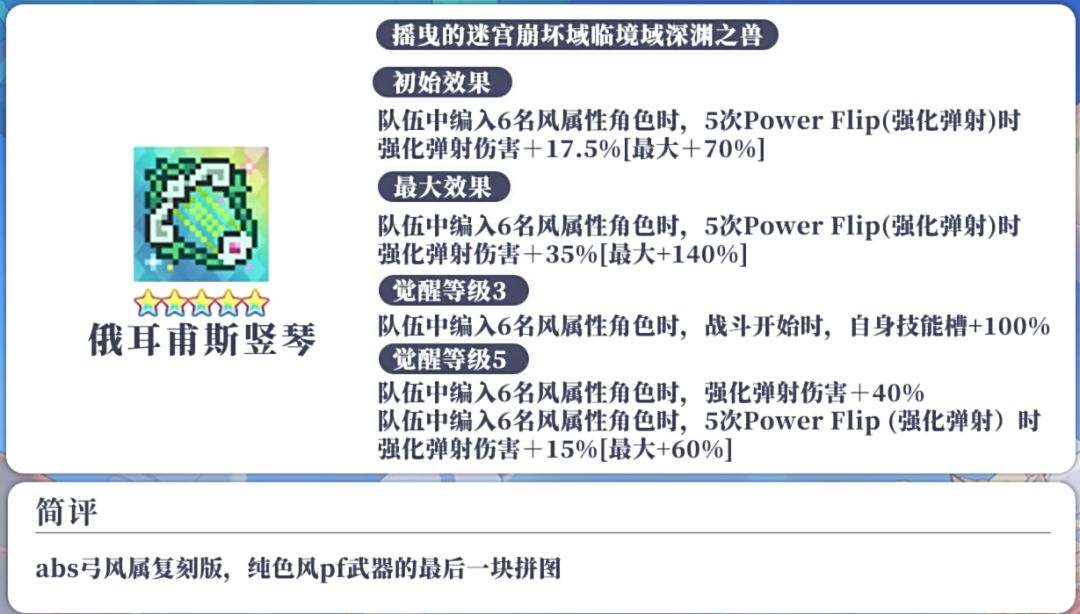 abs琴作为上一次新武器abs弓的风属性复刻版本,除了数值之外机制和体系基本相同,同时也是一直处于未来可期状态的纯色风PF的最后一块拼图,强度还是相当不错的,如果已经兑换了优先级相对靠前的武器的小伙伴推荐本次兑换abs琴