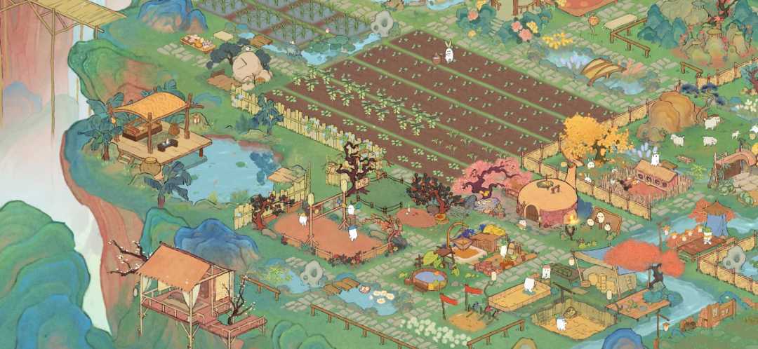 溪水左侧,是很多小动物,在这养鸡养羊。溪水右侧,下面是花圃,会种下吸引蝴蝶的花花。上面是人造景观,登小山赏樱花,还可以在亭子里吃西瓜。