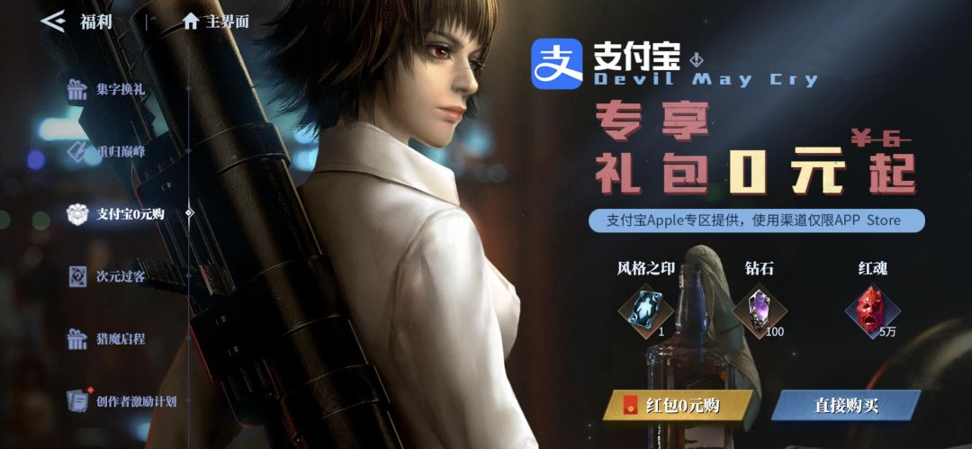 CAPCOM官方正版授权硬核动作手游《鬼泣-巅峰之战》现已正式开服!活动期间,iOS客户端中上架支付宝专享礼包,用户通过游戏活动界面购买指定礼包时最高可享受一次6元优惠。