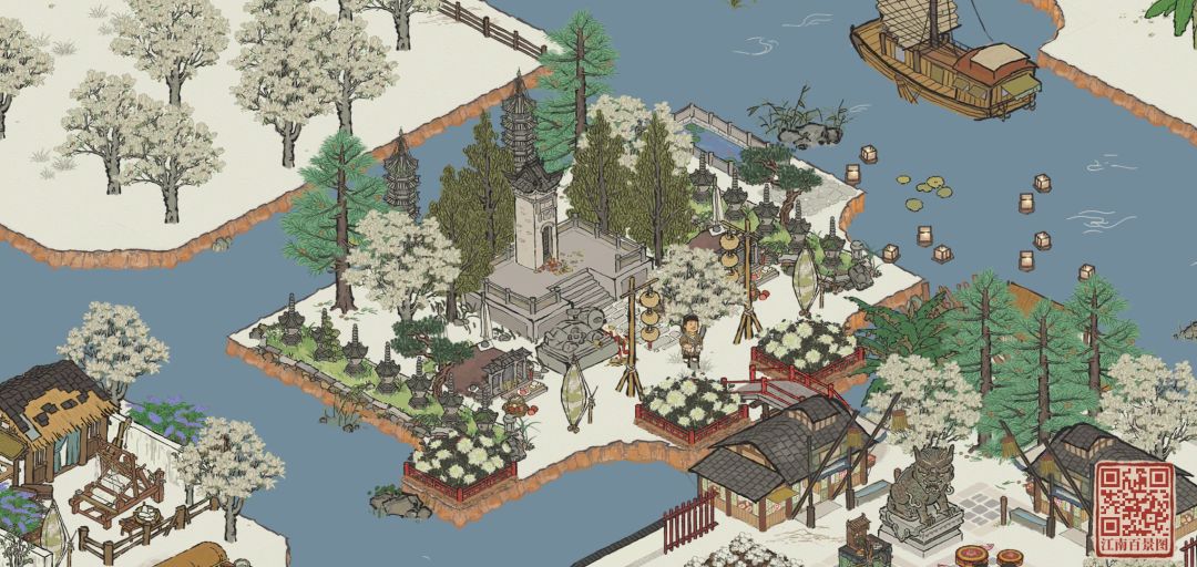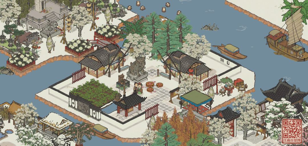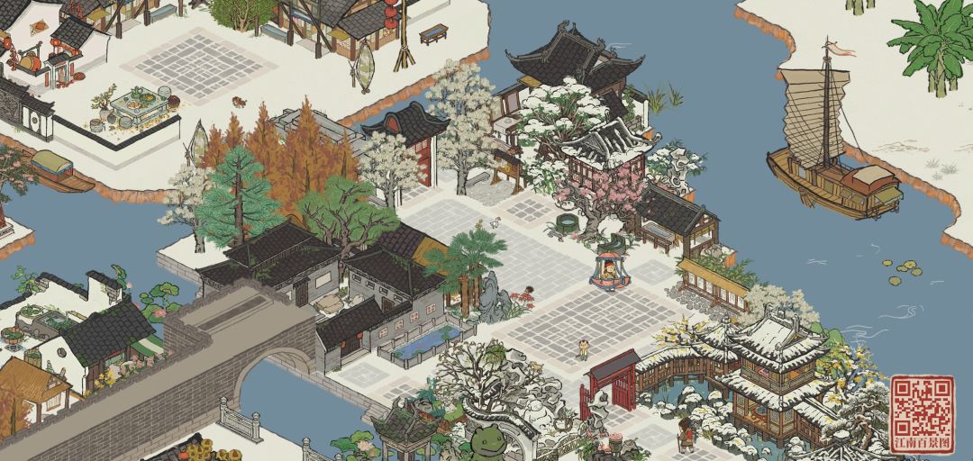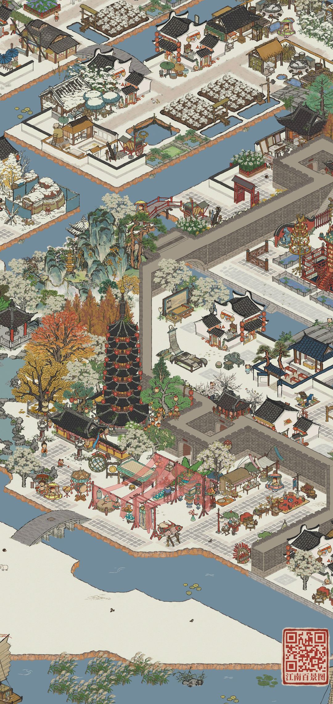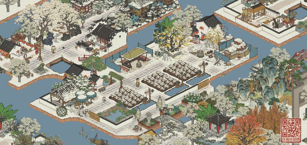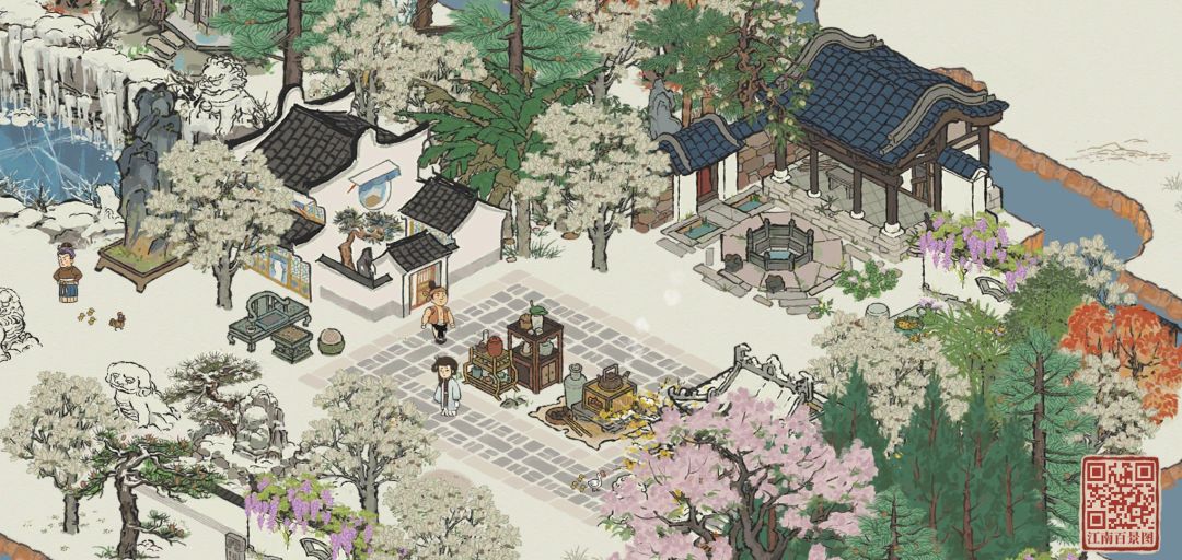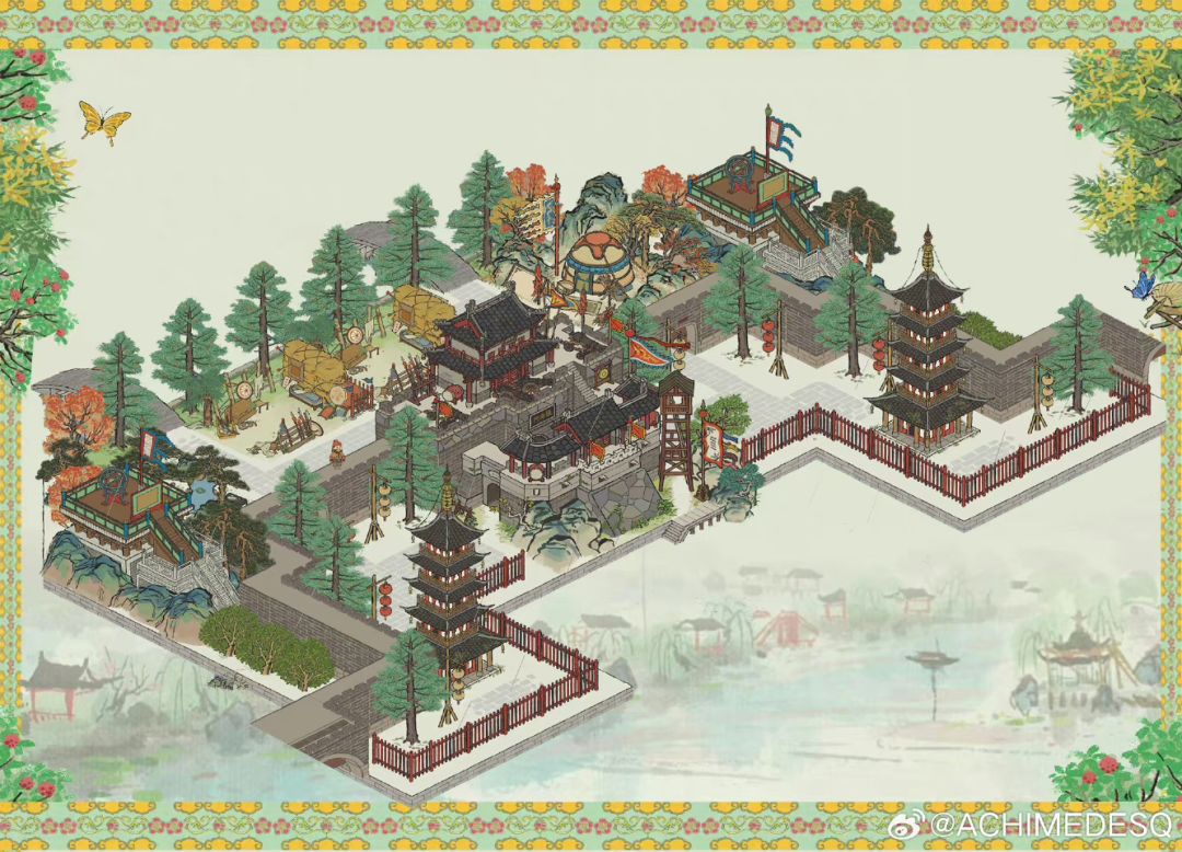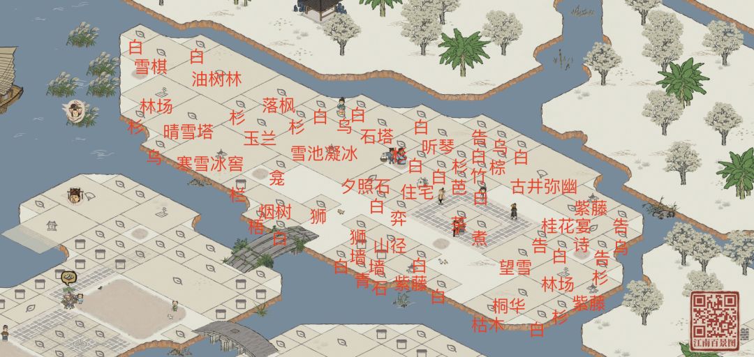 打倭寇的左边地区,雪落腊梅+梅园+树下圆凳+登龙台碑+雪屋夜棋+湖上回廊+白玉兰+竹间雅座+布鞋生产(这里升5级全黑和雪更配)+柳杉+白菊花+告示牌+不老山+2级住宅(这里要么别放住宅,要么就放2级住宅,试了很多遍的结果)+砖刻照壁x2+堂前睡莲+太湖石(可以自由发挥哈)