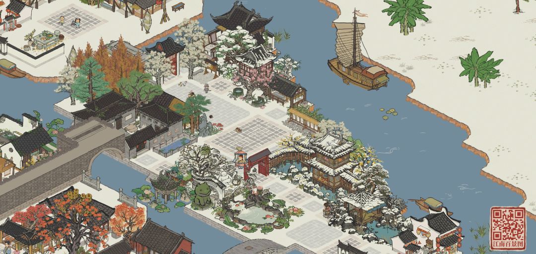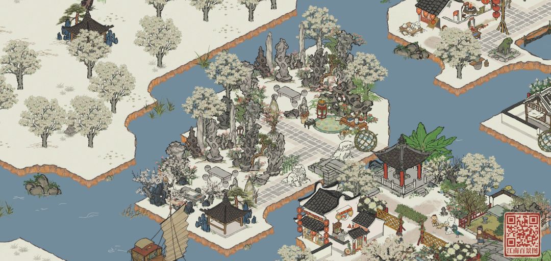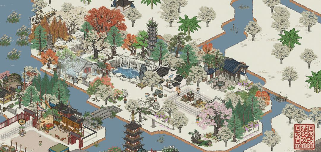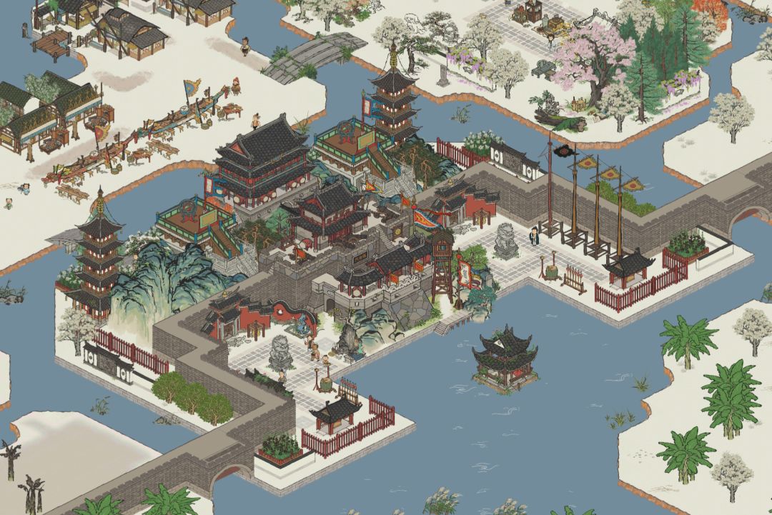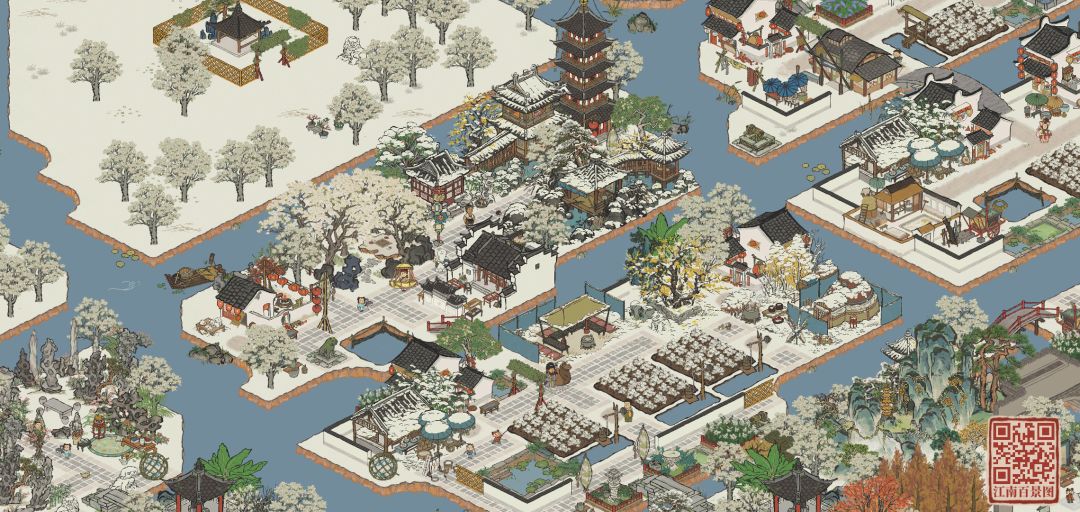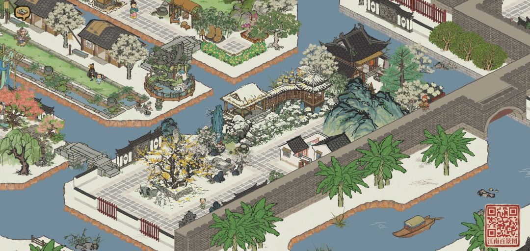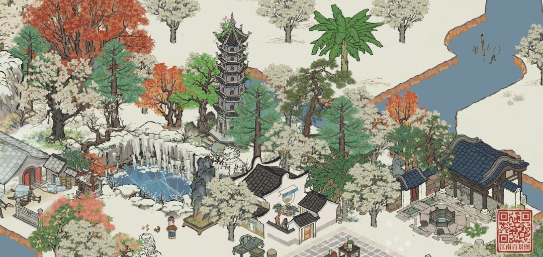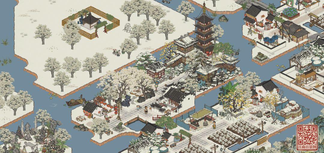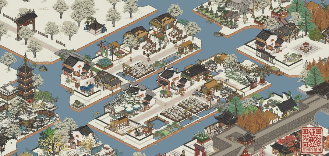 打倭寇的左边地区,雪落腊梅+梅园+树下圆凳+登龙台碑+雪屋夜棋+湖上回廊+白玉兰+竹间雅座+布鞋生产(这里升5级全黑和雪更配)+柳杉+白菊花+告示牌+不老山+2级住宅(这里要么别放住宅,要么就放2级住宅,试了很多遍的结果)+砖刻照壁x2+堂前睡莲+太湖石(可以自由发挥哈)