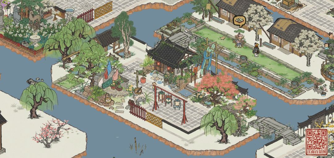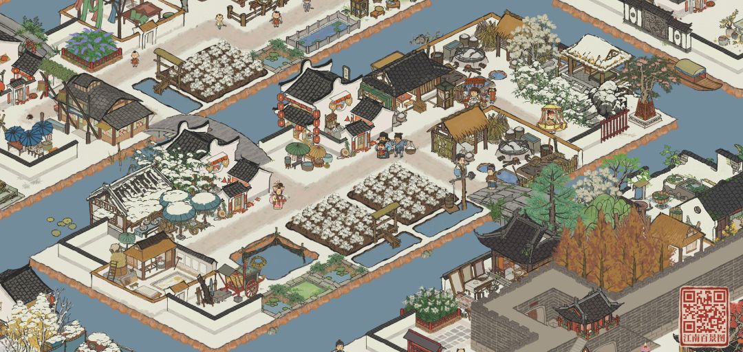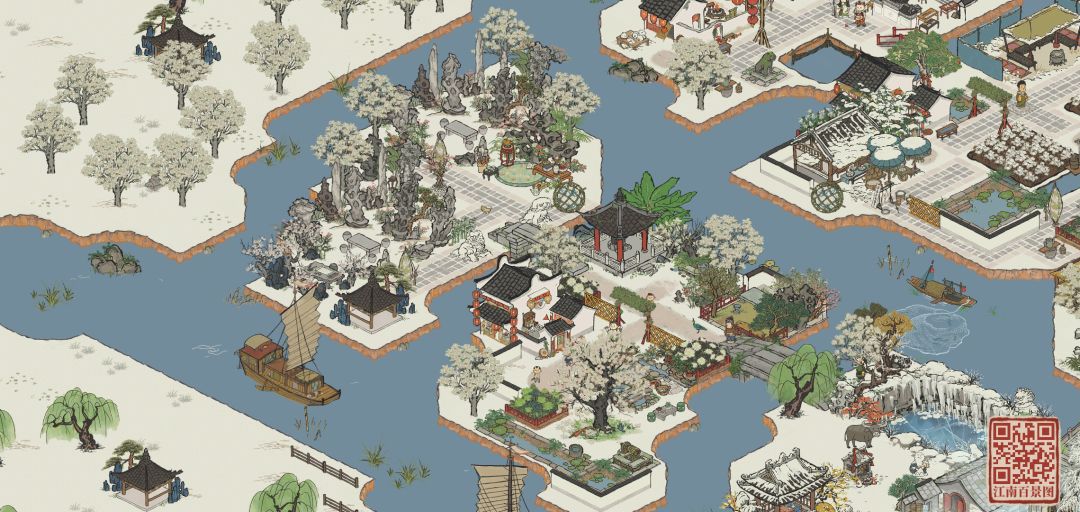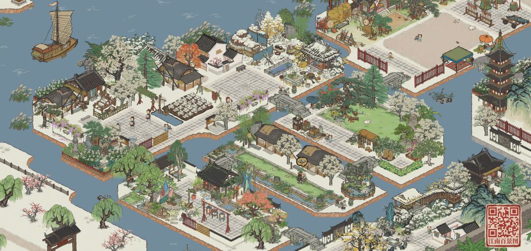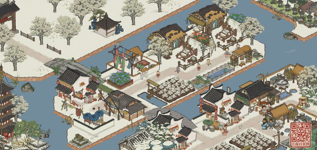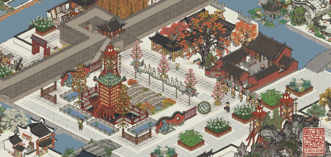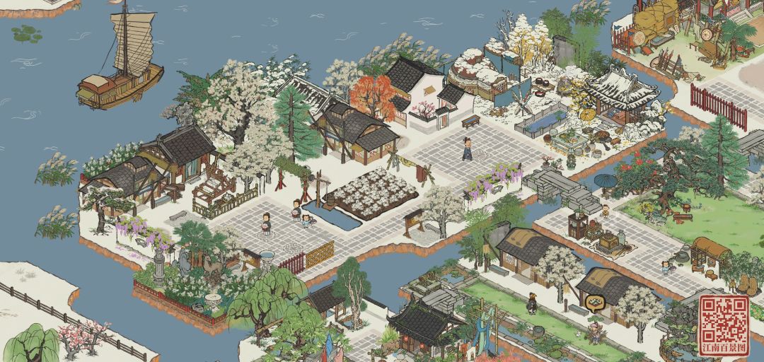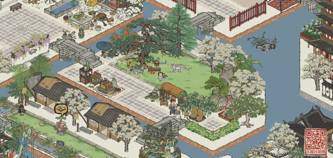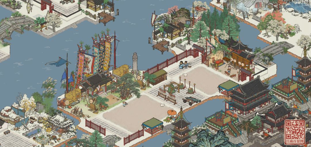 打倭寇的左边地区,雪落腊梅+梅园+树下圆凳+登龙台碑+雪屋夜棋+湖上回廊+白玉兰+竹间雅座+布鞋生产(这里升5级全黑和雪更配)+柳杉+白菊花+告示牌+不老山+2级住宅(这里要么别放住宅,要么就放2级住宅,试了很多遍的结果)+砖刻照壁x2+堂前睡莲+太湖石(可以自由发挥哈)