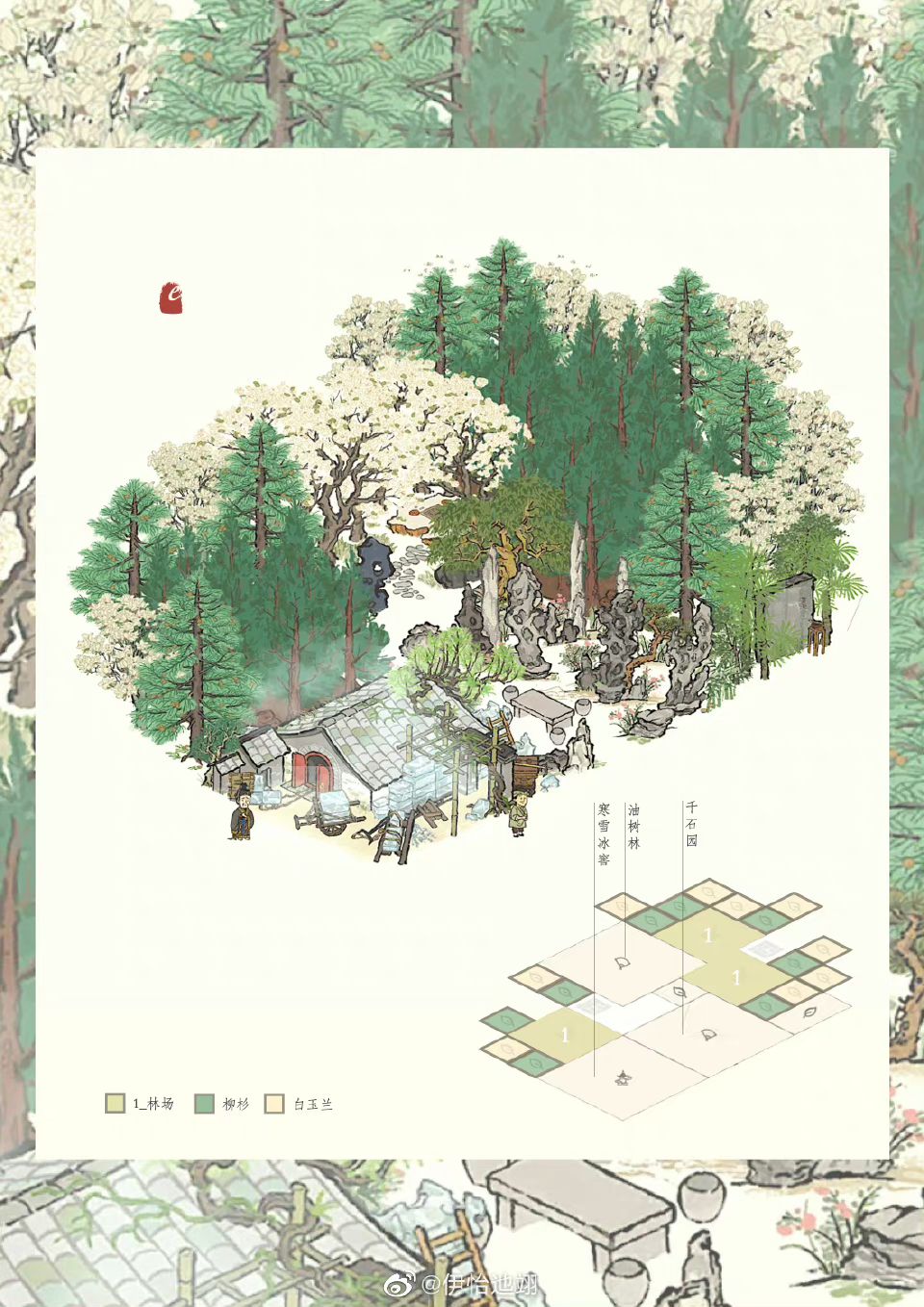参考图如下,他原来应该放在了扬州,我还是依照雪景主题,在植物上选的柳杉+白玉兰