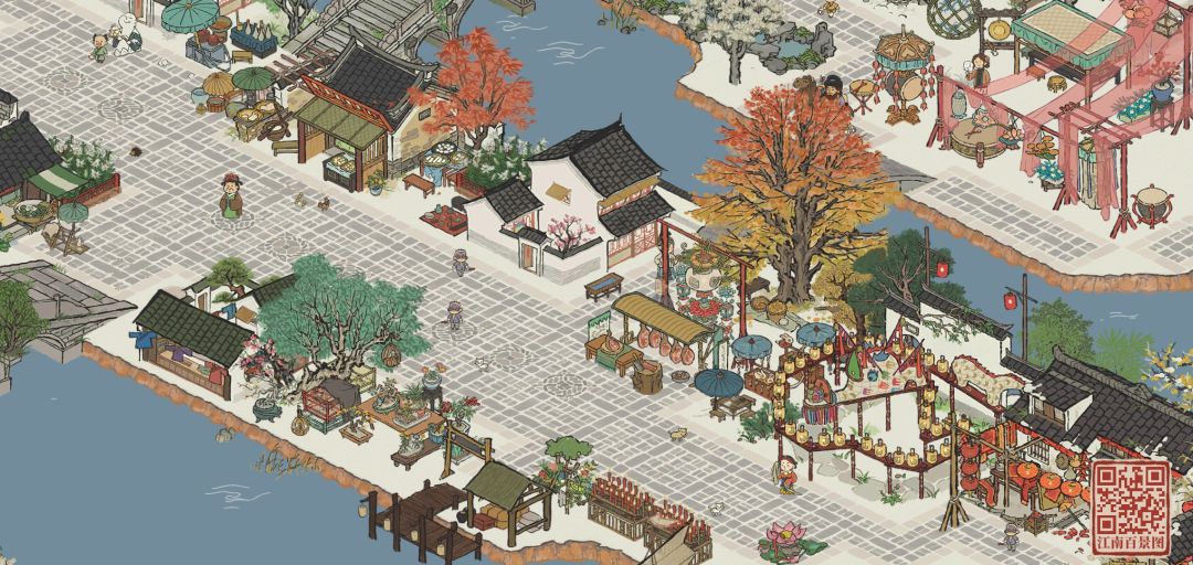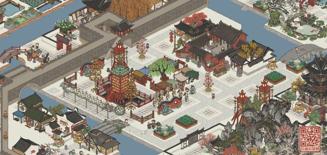 第二块:专门为两个餐馆搭的景(4级餐馆和景色更配哦⊙∀⊙!),目的是和前后呼应,颜色上用了相近的建筑。例如,草地和后面的草坪呼应,山水庭帐和、烟雨水道和前面的庭中浣衣呼应。