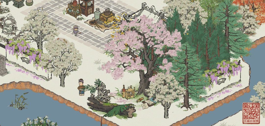 绿云松+柳杉+白玉兰+朱瑾+算卦摊+茶具架+煮茶炉+分茶摊+打坐石+望峰楼+石斛兰+蕉下听风+梧桐+花开树篱x3
