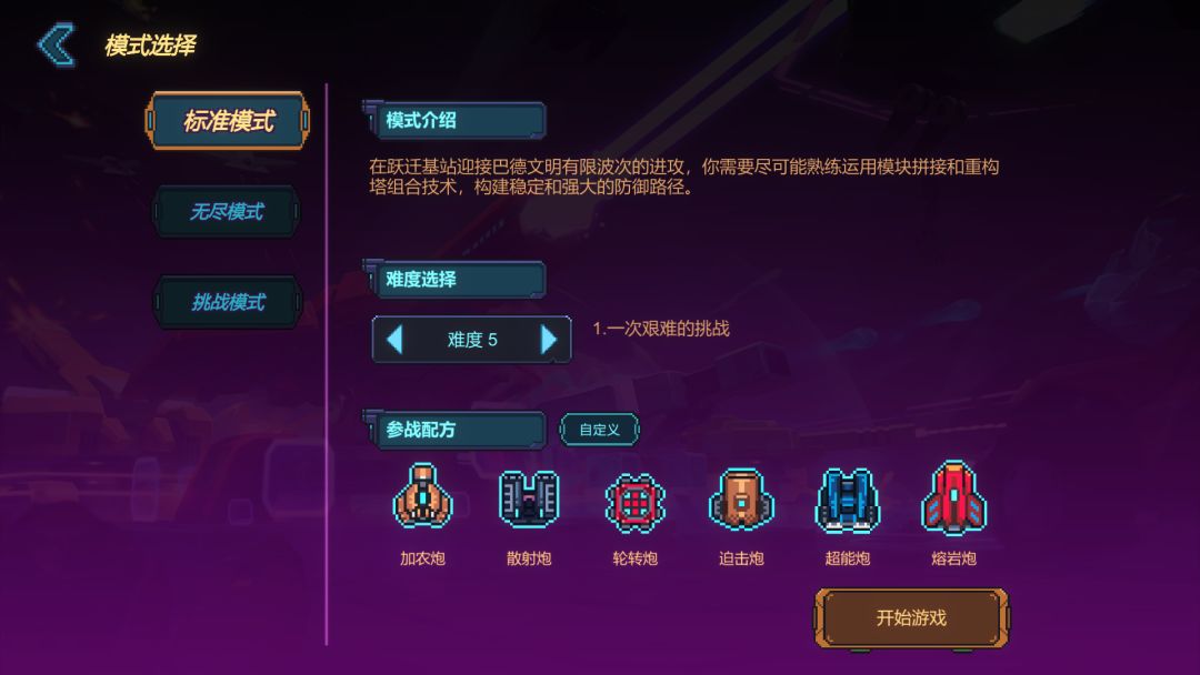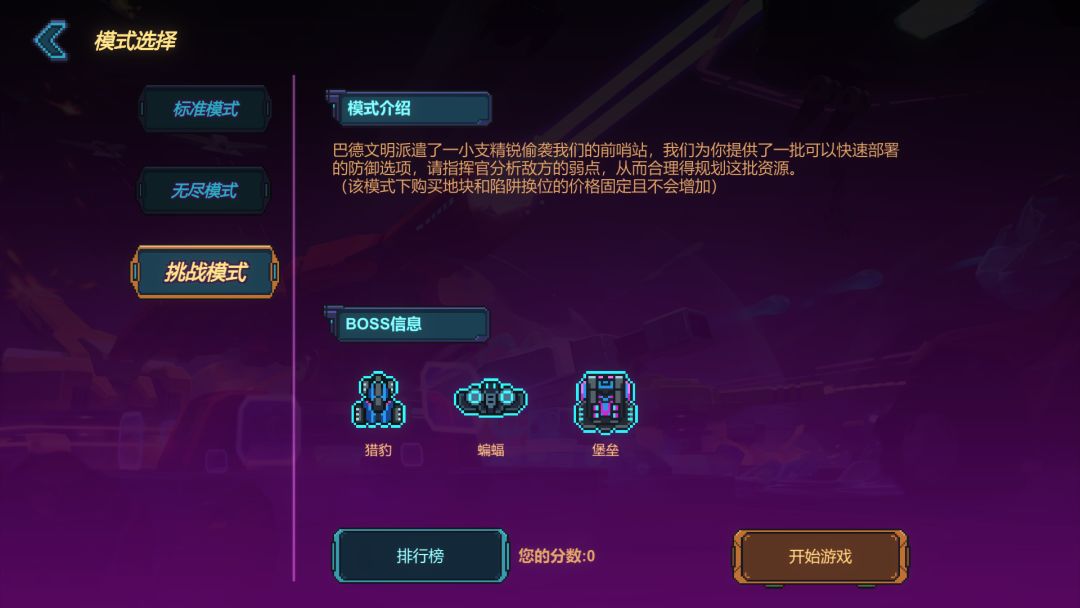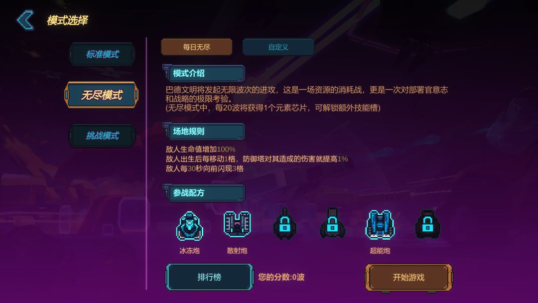 无尽模式:需要大家已经通关难度6之后才会开启,无尽模式可以自定义场地规则,初始生命盾为10。无尽模式拥有每周的挑战排名(按照坚持的波次降序排列),排名每周一0点重置(需要联网才能上传排名)。
