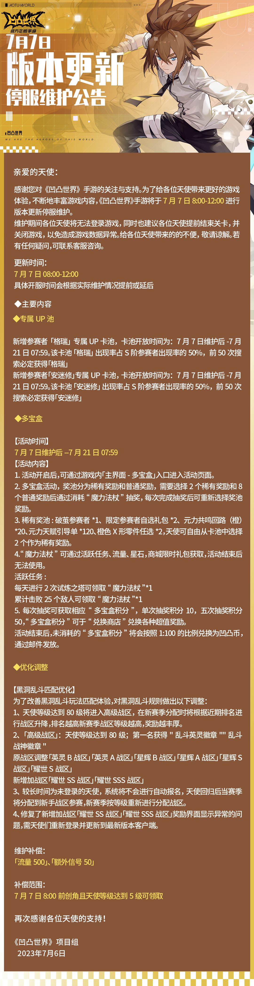 感谢您对《凹凸世界》手游的关注与支持。为了给各位天使带来更好的游戏体验,不断地丰富游戏内容,《凹凸世界》手游将于7月7日8:00-12:00进行版本更新停服维护。