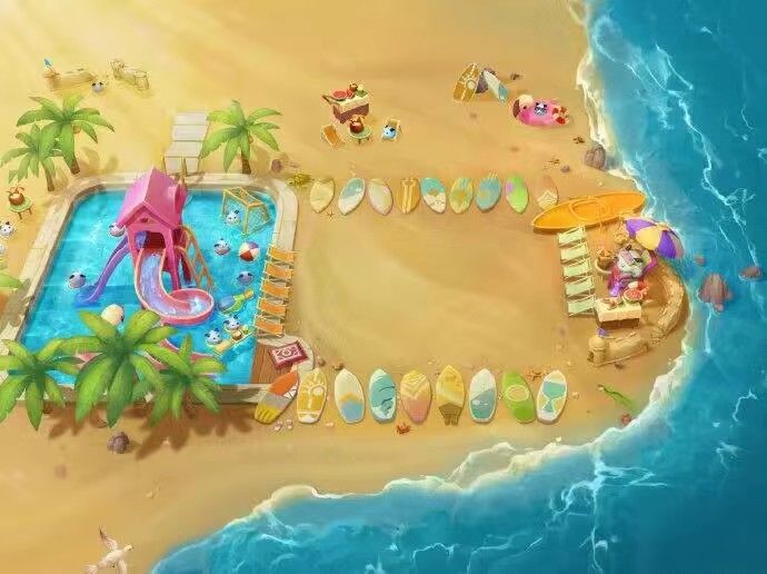 棋盘是水上乐园主题,自带海景那种,左侧有个夏日感max的水上乐园,里面有好多魄罗在玩水,金币槽改成了沙滩躺椅,吃鸡后会有水炮礼花从左侧的泳池炮台上射出,海滩场景清凉感拉满,突出的就是一个应景。