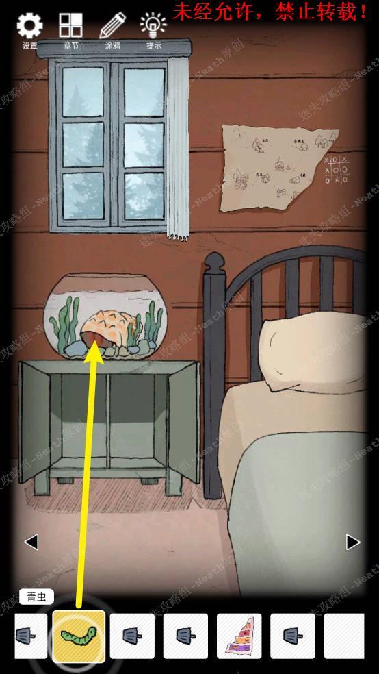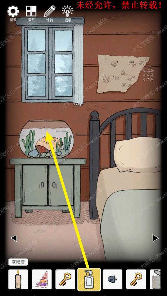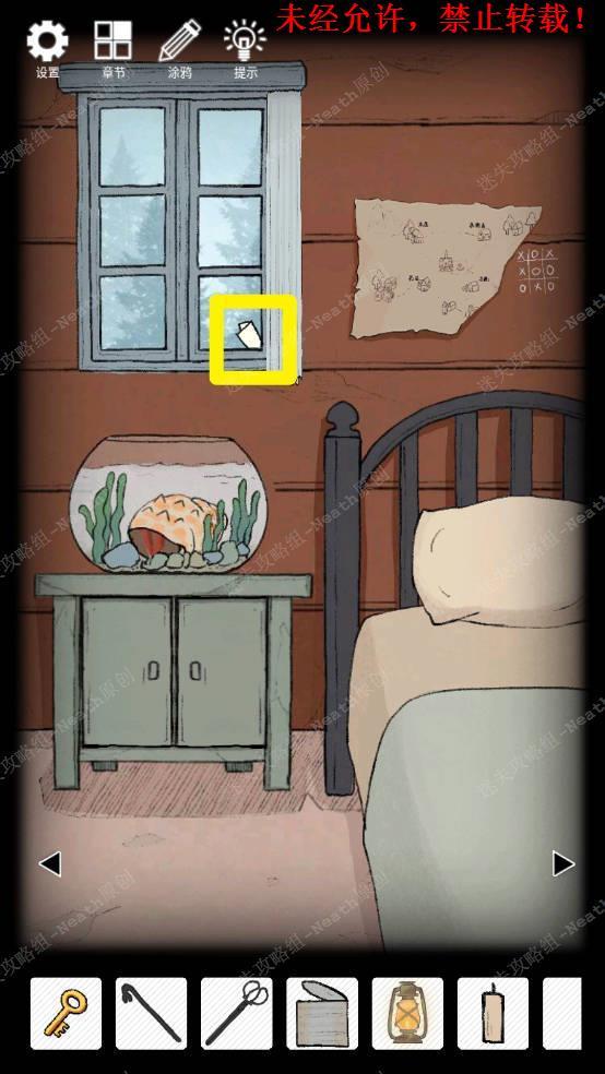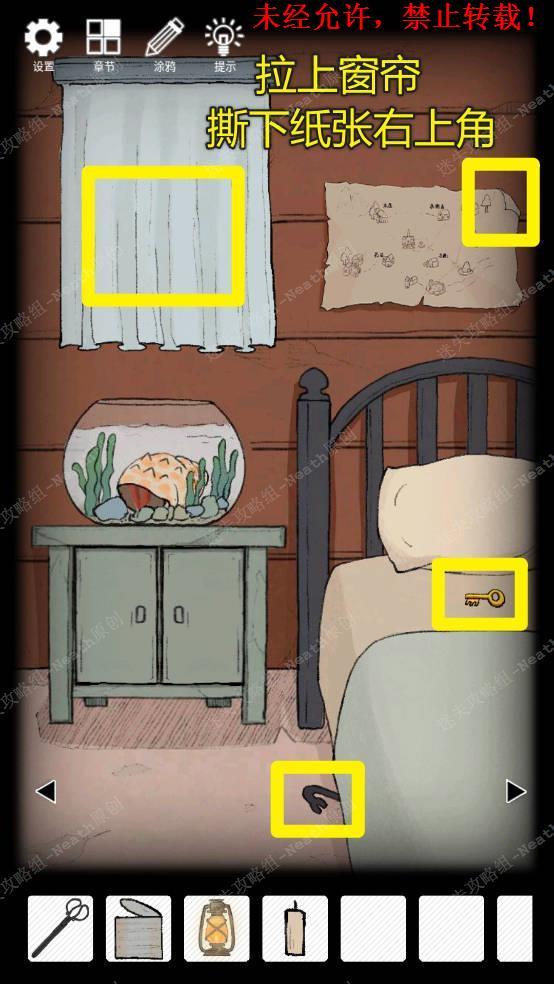 3、向右移动到鱼缸场景,拿走床下的【撬棍】,移开枕头拿走【钥匙C】,拉上窗帘,撕下墙上地图的右下角,再次拉开窗帘,拿走【白纸】。3 3.1