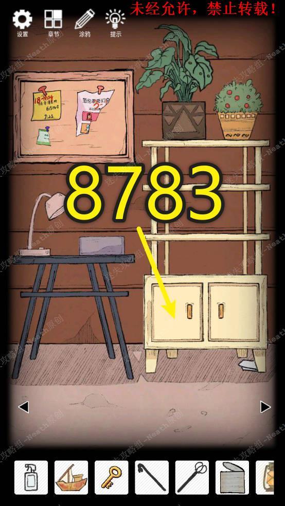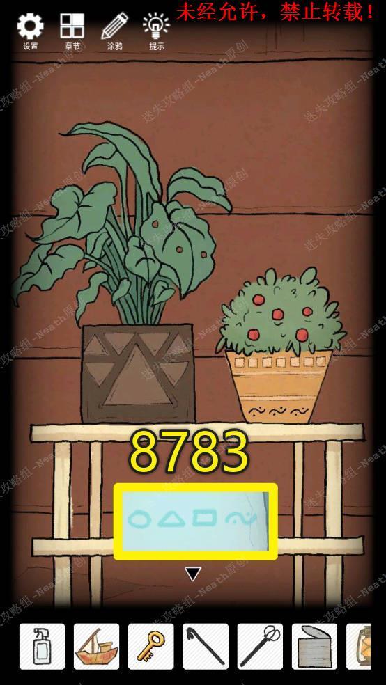 5、观察架子上两盆植物上的符号,发现圆形有8个,三角有7个,方形有8个(左边花盆也算一个方形),波浪号有3个,以白纸上的符号为顺序得到一组密码8783,在左边柜子上输入密码8783拿走【旋钮】。5 5.1