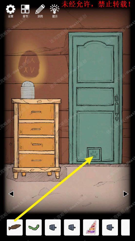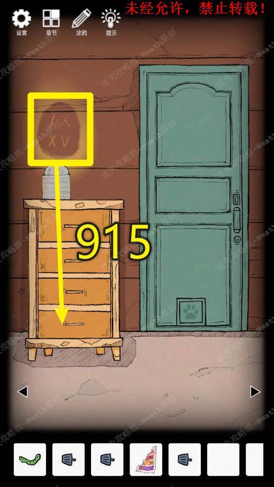 12、到门场景,把【点燃的蜡烛】放到烛台上,用【空罐头】盖住,观察墙上的罗马数字,IX和XV,他们分别代表9和15,在最下面的抽屉上输入密码915,拿走【小鱼干】。12 12.1