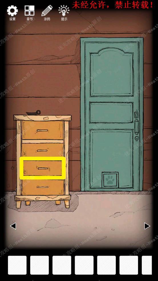 13、把【小鱼干】放到门下有爪子标记的地方,拿走【钥匙B】,使用这把钥匙打开第二层抽屉拿走【旋钮】。13