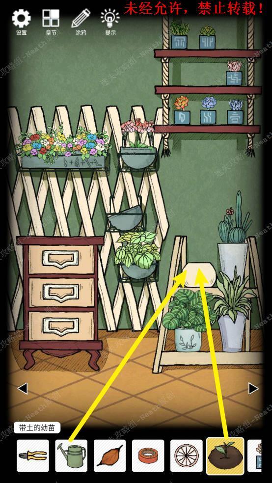 21、向右移动,拿到笔筒里的【破窗锤】和【螺丝刀】,打开第三层抽屉拿到【小铲子】,使用【小铲子】挖开带绿苗的花盆,拿走【钥匙A】,得到【带土的幼苗】。21