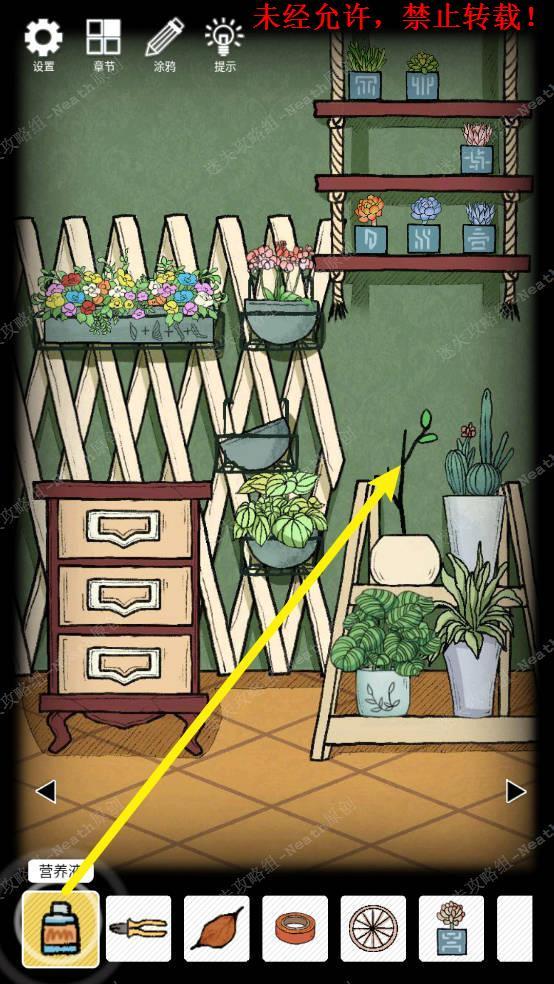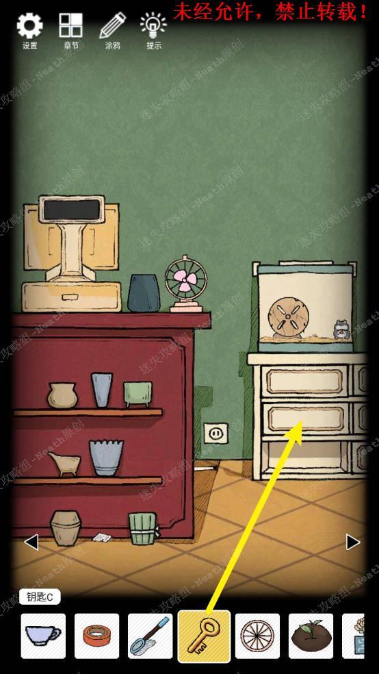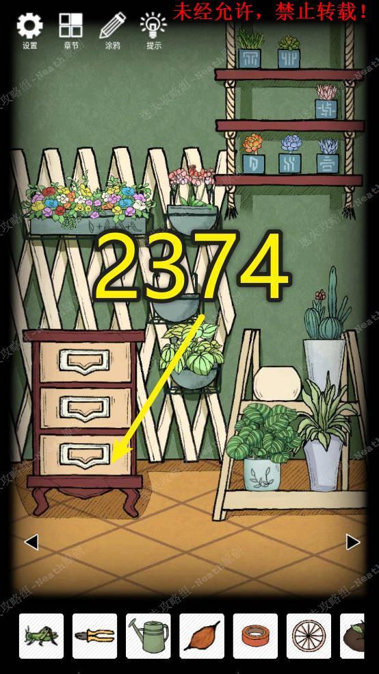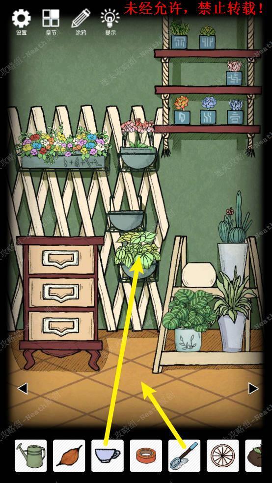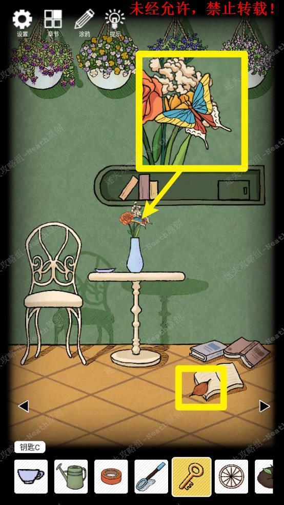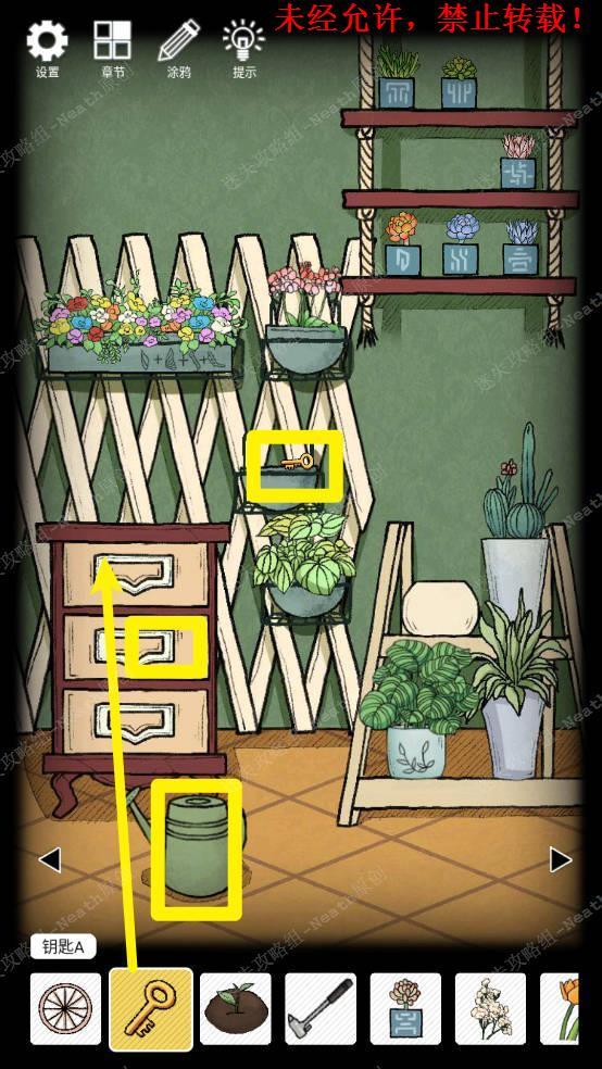 23、向右移动,摇晃没花的花盆,得到【钥匙C】,使用【钥匙A】打开第一层抽屉拿走【捕虫网】,打开第二层抽屉拿走【绝缘胶带】,拿走地上的【空的洒水壶】。23