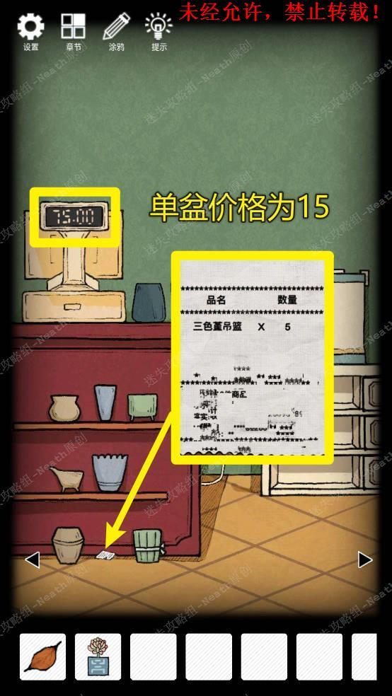 37、观察地上的纸张,发现三色堇卖出5盆,根据收银机上的总金额75算出单盆价格为15。37