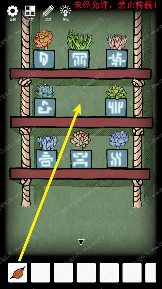 39、把两个【多肉盆栽】放到多肉盆栽架子上,根据书籍和羊皮卷的提示摆放盆栽,答案如下图所示,然后把【枯树叶】放到中间,最后拿走长出植物上的【浆果】。39