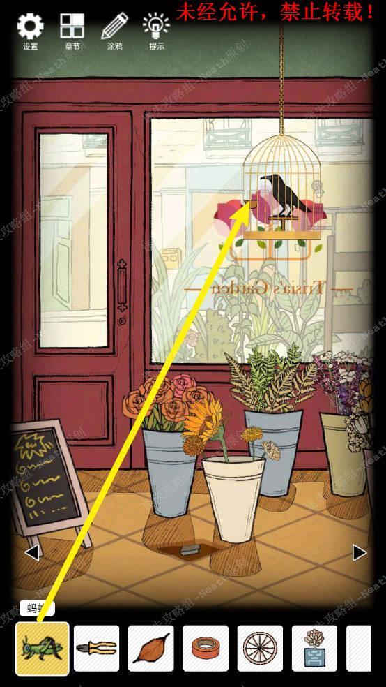 28、到花盆场景,对柜子右边的盆栽使用【咖啡】,再使用【捕虫网】抓住地上的【蚂蚱】。28