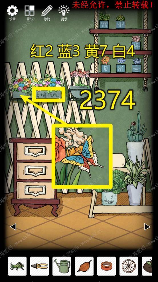 29、根据蝴蝶翅膀上不同颜色的部位,在花篮里数出不同颜色花的数量,花篮下的提示是顺序,得到一组数字是2374,在最下层抽屉输入这个密码,得到提示。29 29.1