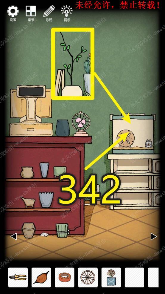 34、在仓鼠笼子上输入密码342打开笼子,使用【尖嘴钳】卸下坏跑轮,换上【扇叶罩】后多次点击仓鼠,然后切换场景稍作等待,在仓鼠身边拿走【花生】。34 34.1