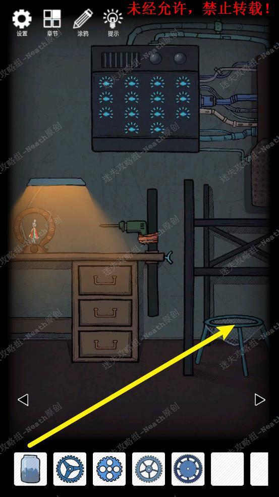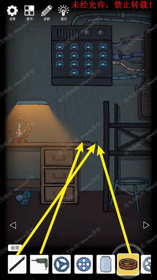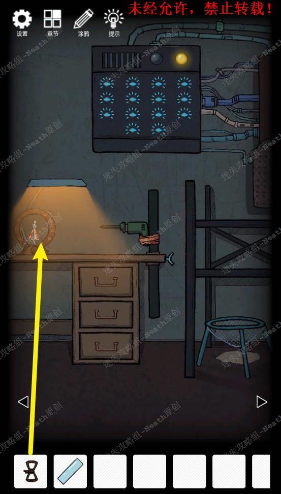 42、向右移动到台灯场景,拿走【胶带】、【螺丝刀】、【圆锯】,三层抽屉里拿到【钥匙A】、【玻璃瓶】、【润滑剂】。42