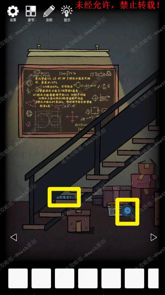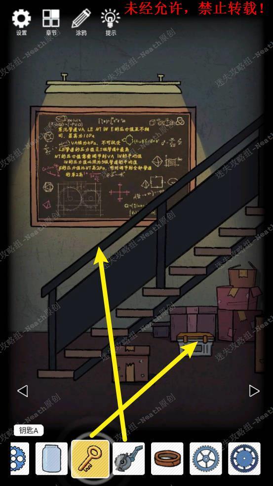44、到初始场景,使用【钥匙A】打开盒子拿走【电钻】,使用【圆锯】割下楼梯扶手上的【钢管】。44