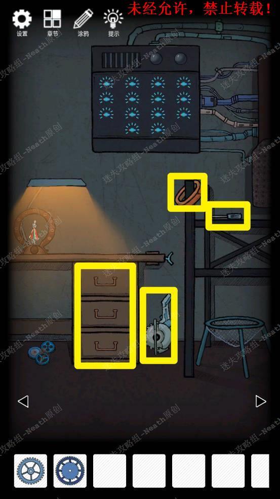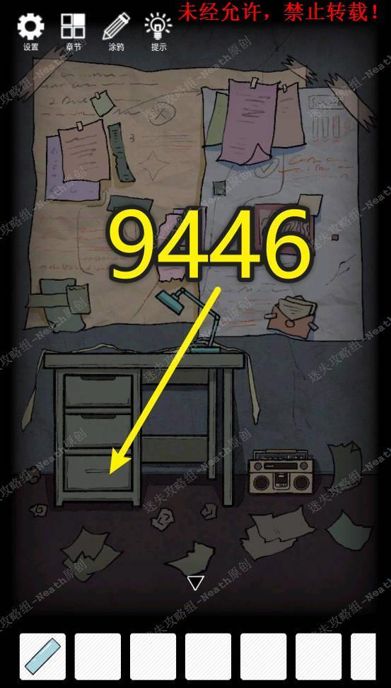 51、进入房门,在最下面抽屉上输入密码9446拿走【发条钥匙】。51