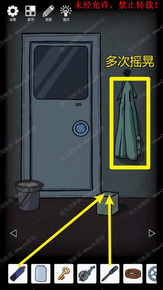 43、向右移动两次到门边,多次点击衣服,拿走【齿轮20】,使用【润滑剂】和【螺丝刀】打开盒子拿走【齿轮30】。43